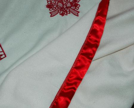 You will need 2 yards of light-colored fleece, satin blanket binding for finishing the edges and embroidery threads. We chose white fleece, bright red binding and bright red thread for the embroidery.