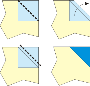 | Draw a diagonal as shown. Stitch along the diagonal. Cut 1/4" from the stitchline.